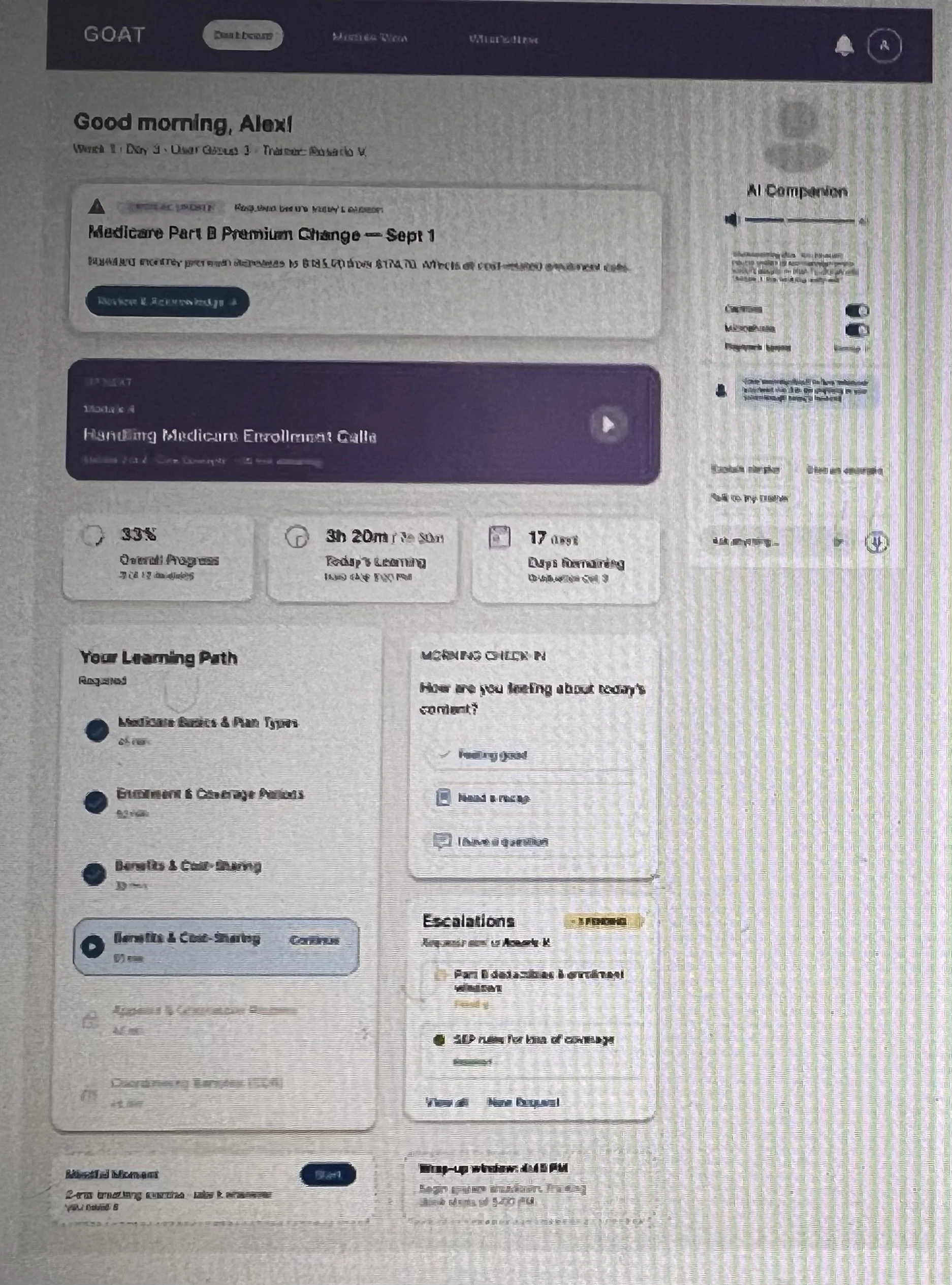 Project GOAT is an AI-powered learning and coaching platform designed to support customer service representatives at CVS from onboarding through continuous development.